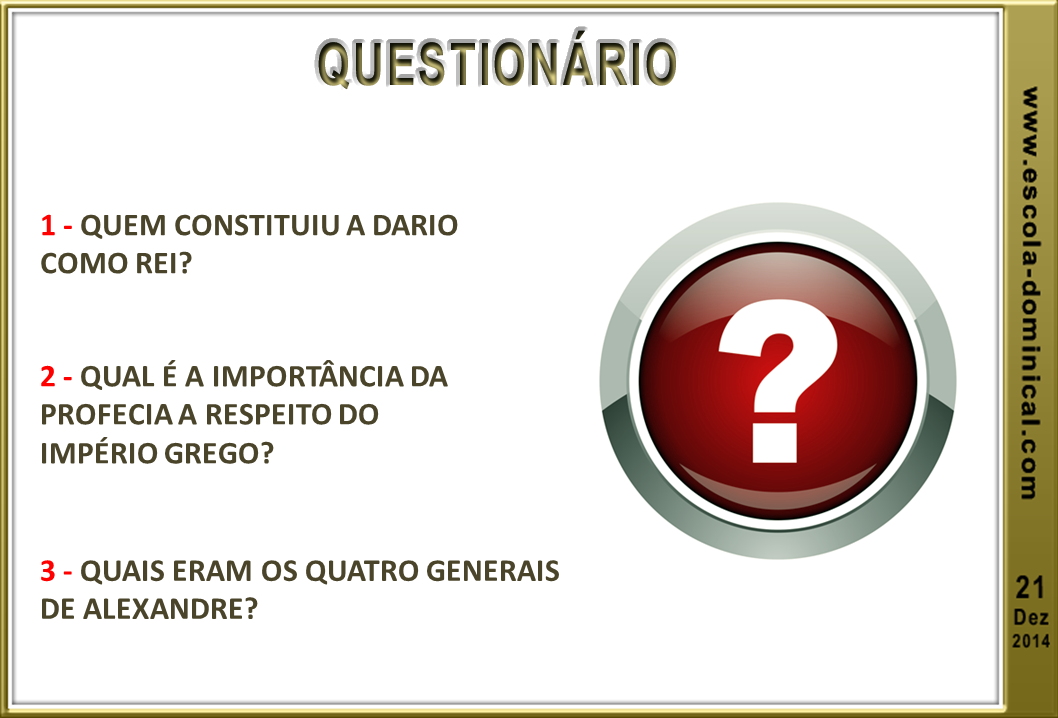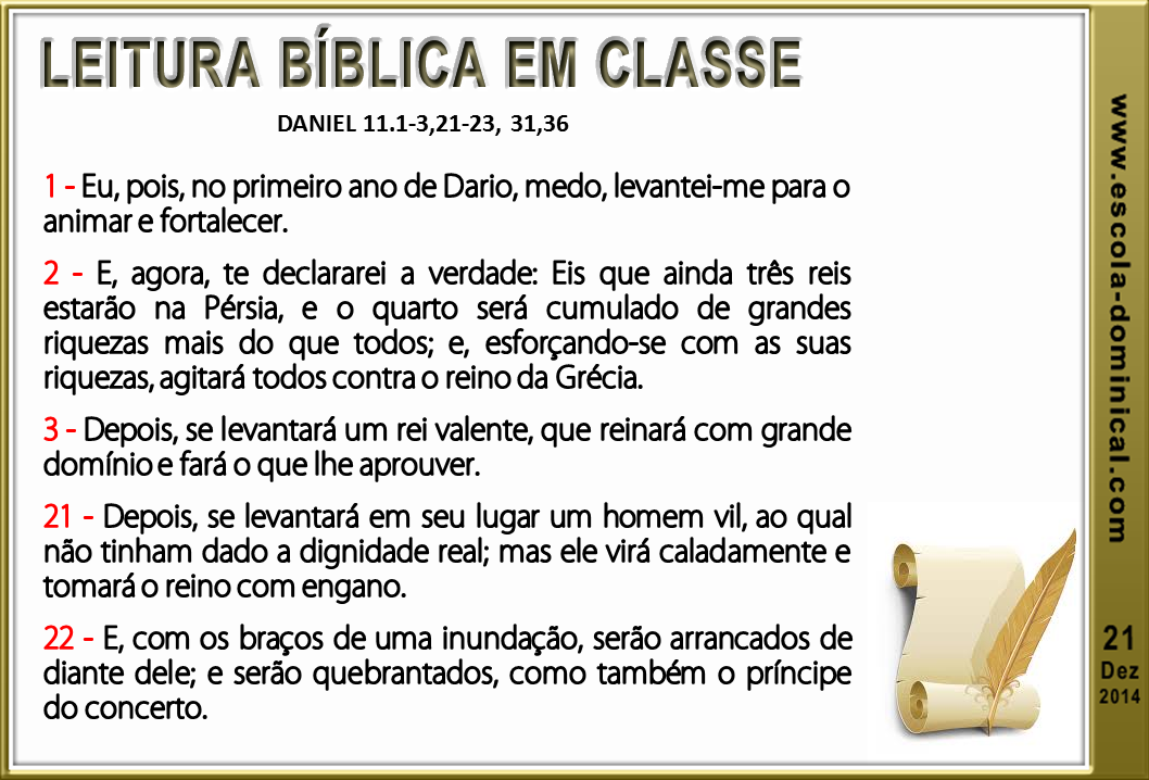 1. A revelação sobre o fim do Império Medo-Persa (11.2). Aparece no versículo primeiro o nome do rei "Dario, o medo" que é o mesmo de Daniel 5.31. A história bíblica diz que Ciro constituiu a Dario como rei. No capítulo onze é revelado a Daniel uma sucessão de reis que vai de Ciro até o desmoronamento do reino de Alexandre. Foi revelado a Daniel que o rei valente (v.3), Alexandre, se levantaria e dominaria muitos reinos, todavia o Senhor mostrou também que embora imponente, o reino de Alexandre seria partido aos quatro ventos do céu (v.4). Os reinos deste mundo, por mais importantes que sejam, são todos passageiros. Somente o Reino de Deus é eterno.