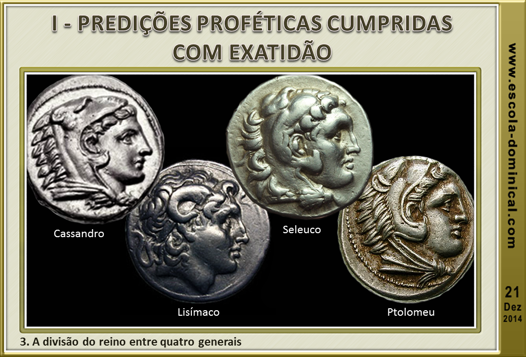 3. A divisão do reino entre quatro generais (11.4-20). Afirma o versículo quatro que "estando ele em pé, o seu reino será quebrado". Alexandre morreu na Babilônia aos 33 anos de idade. O seu reino, como havia sido revelado pelo Senhor, "foi repartido para os quatro ventos do céu" (v.4). Alexandre não teve um sucessor e seu reino foi dividido entre os seus quatro generais: Cassandro, Lisímaco, Seleuco e Ptolomeu. Ainda que os historiadores neguem a questão da soberania de Deus no destino das nações, não podemos duvidar que Ele permite que reinos sejam estabelecidos e destruídos. "Os quatro ventos do céu" (v.4) lembra a profecia sobre a figura das quatro cabeças do leopardo alado (7.6) e a visão do bode com quatro chifres notáveis (8.8). As figuras são diferentes, mas as representações dessas figuras são as mesmas, porque falam do Império Grego e sua divisão, depois da morte de Alexandre. Cassandro reinou na Macedônia; Lisímaco reinou na Trácia e Ásia Menor; Ptolomeu reinou no Egito e Seleuco reinou sobre a Síria e o restante do Oriente Médio.