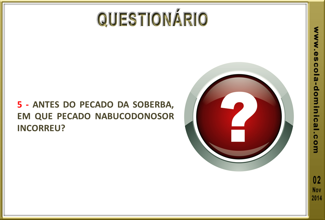 Na aula de hoje estudaremos o capítulo quatro de Daniel, cujo conteúdo consiste de um testemunho pessoal do rei Nabucodonosor. Ele foi submetido a um estado de loucura, resultante de sua soberba, que o levou a viver como um animal do campo por "sete tempos", até que Deus o tirou daquela condição. Ao final desse período, Nabucodonosor reconheceu a soberania do Deus dos cativos de Judá.