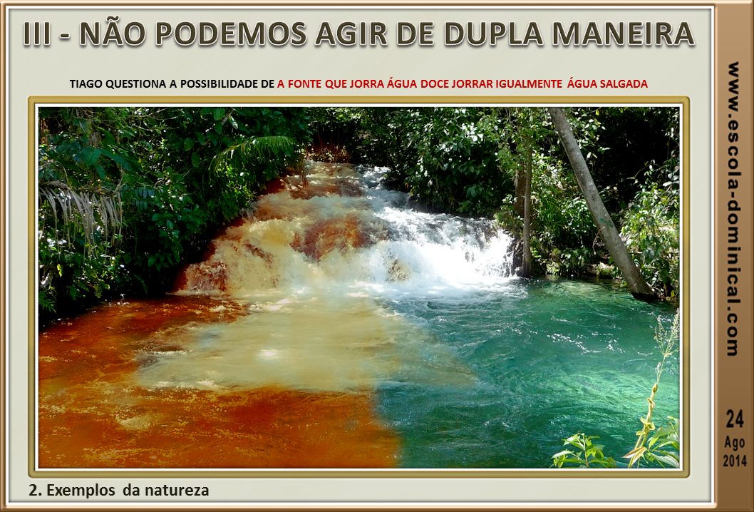 2. Exemplos da natureza (vv.11,12). O líder da igreja de Jerusalém usa dois exemplos da natureza para apontar a incoerência de agirmos duplamente. Tiago questiona a possibilidade de a fonte que jorra água doce jorrar igualmente água salgada. Para provar a impossibilidade natural deste fenômeno, o meio-irmão do Senhor pergunta, de maneira retórica, se uma figueira poderia produzir azeitonas, e a videira, figos. Naturalmente, a resposta é um sonoro não! Portanto, a pessoa que bendiz ao Senhor não maldiz o próximo. Se Deus é amor, como podemos odiar alguém?