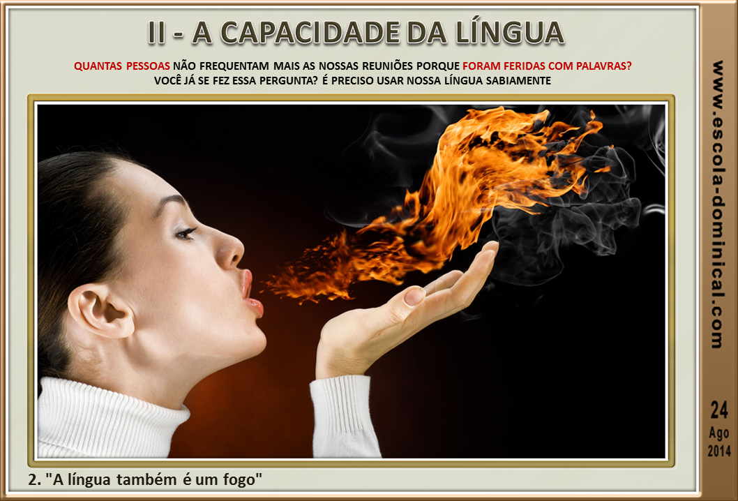 2. "A língua também é um fogo" (vv.6,7). Quantas pessoas não frequentam mais as nossas reuniões porque foram feridas com palavras? Você já se fez essa pergunta? É preciso usar nossa língua sabiamente, pois "a morte e a vida estão no poder da língua [...]" (Pv 18.21). Grande parte dos incêndios nas florestas inicia através de uma pequena fagulha. Todavia, essa faísca alastra-se podendo destruir grandes áreas de vegetação. Da mesma forma, são as palavras por nós pronunciadas. Se não forem proclamadas com bom senso, muitas tragédias podem acontecer.