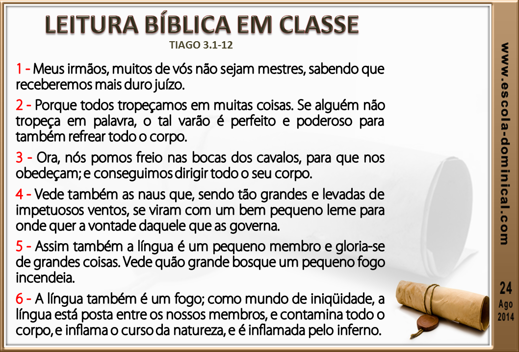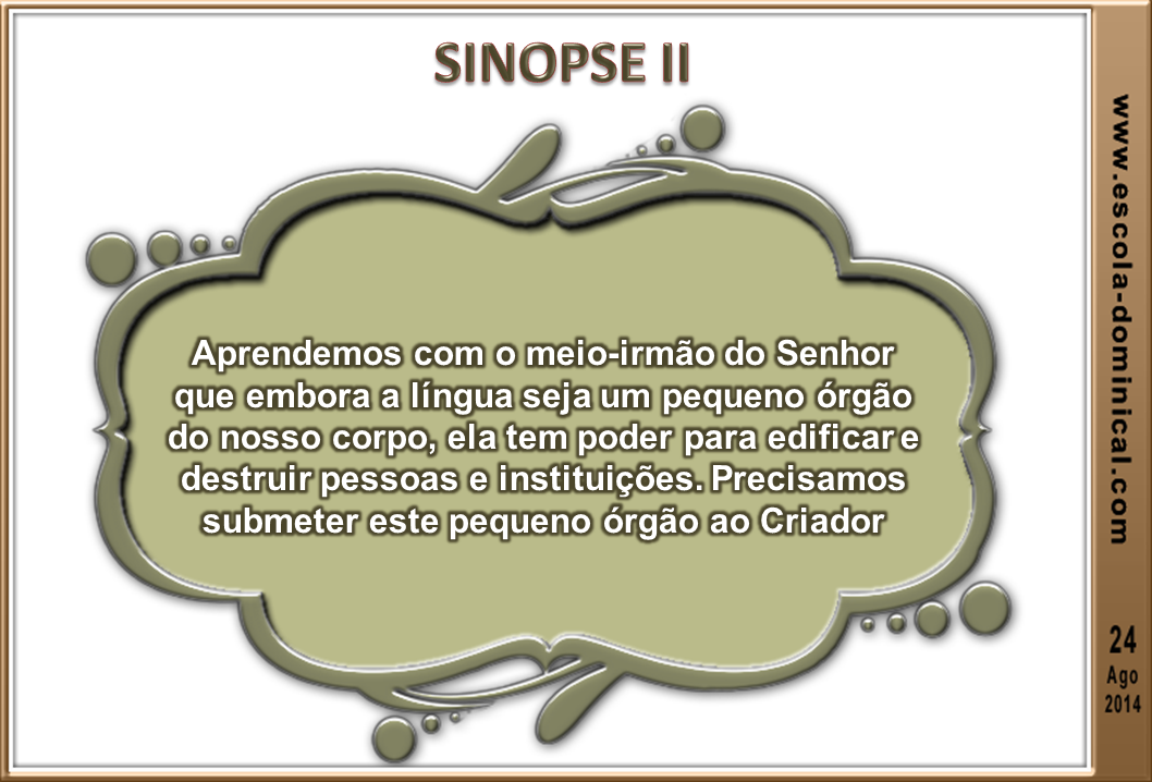 Nessa lição veremos o quanto o crente deve ser cuidadoso na maneira de falar com os outros. Tema do terceiro capítulo da epístola, o meio-irmão do Senhor escreve sobre um pequeno membro do nosso corpo: a língua. Este acanhado, mas poderoso órgão humano, pode destruir ou edificar a vida das pessoas. Por isso, a nossa língua deve ser controlada pelo Espírito Santo a fim de sermos canais de bênçãos para aqueles que nos ouve.