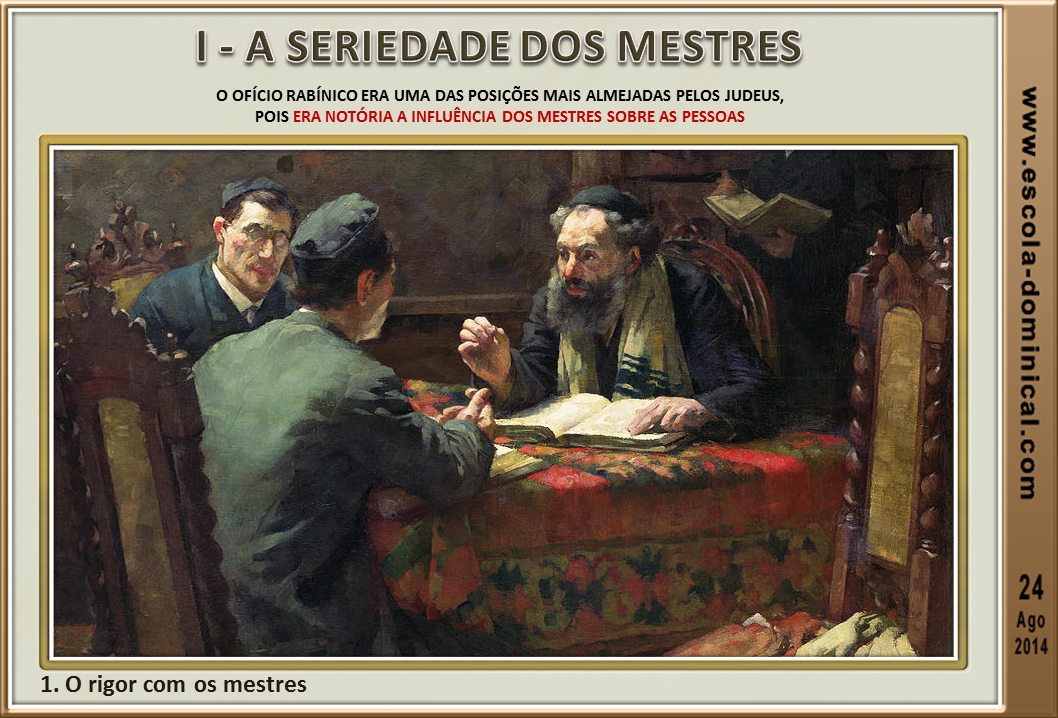 1. O rigor com os mestres. A palavra hebraica para mestre é rabbi, cujo significado é "meu mestre". Os mestres eram honrados em toda a comunidade judaica, gozando de grande respeito e prestígio. Na realidade, o ofício rabínico era uma das posições mais almejadas pelos judeus, pois era notória a influência dos mestres sobre as pessoas (Mt 23.1-7). Daí o porquê de muitos ambicionarem tal posição. E é exatamente alarmado por isso que Tiago inicia então o capítulo três, referindo-se aos que acalentavam essa aspiração, visando obter prestígio, privilégio e fama, a que tivessem cuidado (v.1). Antes de almejarmos o ministério da Palavra devemos estar cônscios de nossa responsabilidade e de que um dia o Altíssimo nos pedirá conta dos atos e dos talentos a nós dispensados.