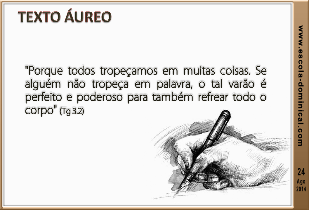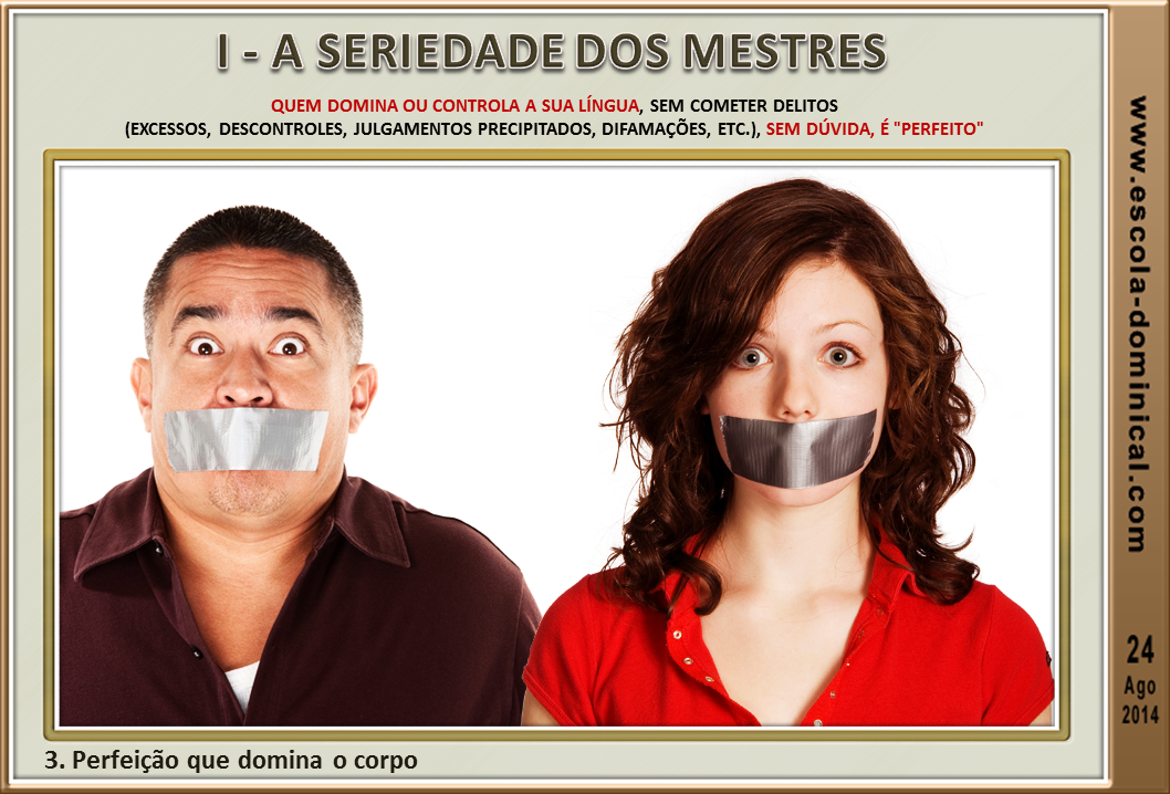 3. Perfeição que domina o corpo (v.2). Quem domina ou controla a sua língua, sem cometer delitos (excessos, descontroles, julgamentos precipitados, difamações, etc.), sem dúvida, é "perfeito". O controle da língua significa que a pessoa tem a capacidade de controlar as demais áreas da vida, pois a língua é poderosa "para também refrear todo o corpo". Quem tem domínio sobre a língua, tem igualmente o coração preservado, pois a boca fala do que o coração está cheio. Discipline-se! Faça um propósito com Deus e consigo mesmo: não empreste os seus lábios para fazer o mal.