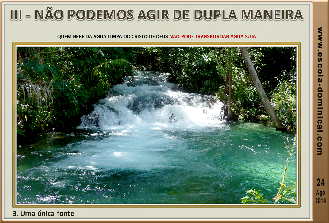 3. Uma única fonte. Aquele que bebe da água da vida não pode fazer jorrar água para morte. Quem bebe da água limpa do Cristo de Deus não pode transbordar água suja. Portanto, a palavra proferida por um discípulo de Cristo deve edificar os irmãos, dar graça aos que ouvem e sarar quem se encontra ferido.