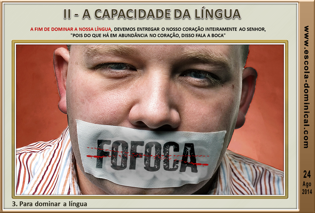 3. Para dominar a língua. Ainda no versículo sete, Tiago faz outra ilustração em relação ao tema do uso da língua. Ele mostra que a natureza humana conseguiu domar e adestrar as bestas-feras, as aves, os répteis e os animais do mar. Mas a língua do ser humano até hoje não houve quem fosse capaz de dominar. Por esforço próprio o homem não terá forças para domar o seu desejo e as suas vontades. Mas quando Deus passa a nos governar, a língua do crente deixa de ser um órgão de destruição e passa a ser um instrumento poderoso e abençoador, usado para o louvor da glória do Eterno. A fim de dominar a nossa língua, devemos entregar o nosso coração inteiramente ao Senhor, "Pois do que há em abundância no coração, disso fala a boca" (Mt 12.34).