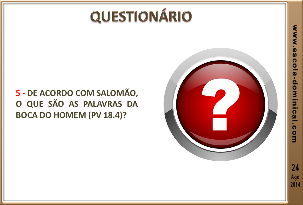Uma vez Salomão disse que a boca do justo é manancial de vida (Pv 10.11), e que as palavras da boca do homem são águas profundas (Pv 18.4). Tomemos o devido cuidado com a maneira como usamos a nossa língua. Não esqueçamos que, no dia do Juízo, daremos conta a Deus de toda palavra ociosa proferida pela nossa boca (Mt 12.36).