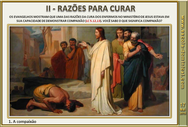 1. A compaixão. Os Evangelhos mostram que uma das razões da cura dos enfermos no ministério de Jesus estava em sua capacidade de demonstrar compaixão (Lc 5.12,13). Você sabe o que significa compaixão? Segundo o Dicionário Houaiss, significa: "sentimento piedoso de simpatia para com a tragédia pessoal de outrem, acompanhado do desejo de minorá-la". Jesus se identifica com o sofrimento humano. Ele cura as enfermidades porque é misericordioso (Mc 3.5; Mt 20.34). E você? Diante dos enfermos e necessitados, tem se mostrado compassivo? Precisamos ser cheios do Espírito Santo para que nossos corações sejam repletos de compaixão pelo próximo.
