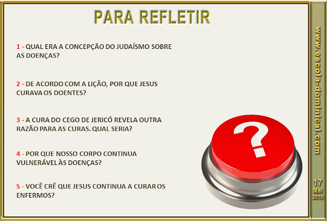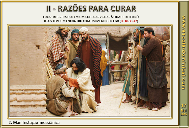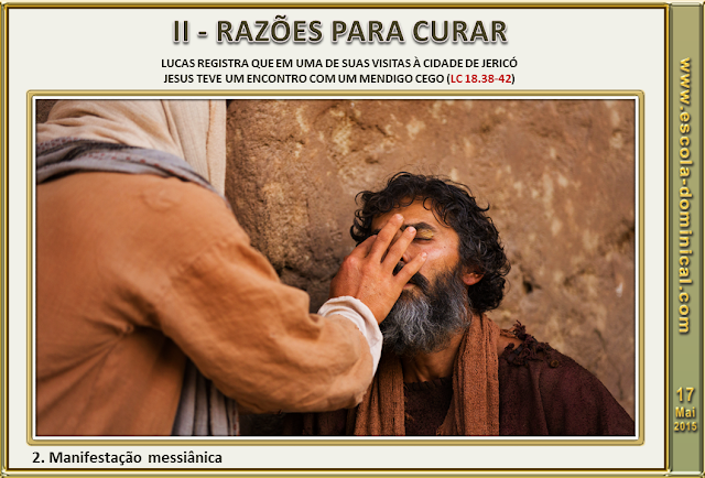 2. Manifestação messiânica. Lucas registra que em uma de suas visitas à cidade de Jericó, Jesus teve um encontro com um mendigo cego (Lc 18.38-42). O relato nos revela outra razão para as curas no ministério de Jesus - a revelação da sua natureza messiânica. O título: "Filho de Davi" usado pelo mendigo era uma clara alusão ao Messias prometido como mostram outros textos bíblicos (Mt 1.1; 12.23; 22.42). Era uma atribuição do Messias curar os doentes (Is 61.1; Lc 4.18). De acordo com Mateus, o Messias tomou sobre si, vicariamente, as nossas doenças e enfermidades (Is 53.4,5; Mt 8.14-17).