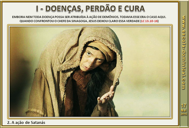 2. A ação de Satanás. É um fato bíblico que toda doença e enfermidade existem como consequência da entrada do pecado no mundo (Gn 2.17). Por outro lado, a Escritura mostra também que há enfermidades que vem por conta do julgamento de um pecado pessoal (1 Co 5.5; 11.30) enquanto outras, como demonstra Lucas, estão associadas à ação de Satanás (Lc 13.10,11). Embora nem toda doença possa ser atribuída à ação de demônios, todavia esse era o caso aqui. Quando confrontou o chefe da sinagoga, Jesus deixou claro essa verdade (Lc 13.16). Jesus demonstrou seu poder sobre a enfermidade e sobre aquele que a causara, Satanás.