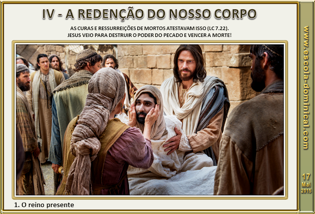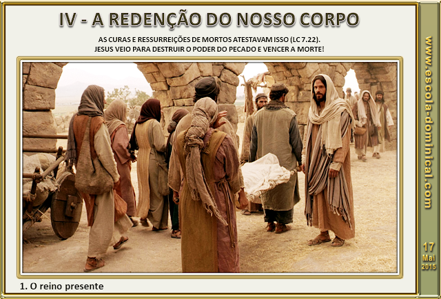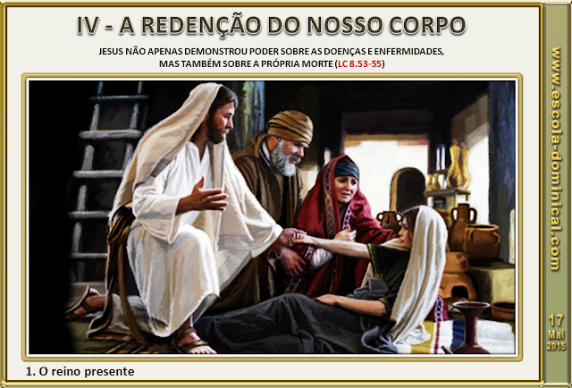 1. O reino presente. Jesus não apenas demonstrou poder sobre as doenças e enfermidades, mas também sobre a própria morte (Lc 8.53-55). Um dos aspectos da manifestação do Reino de Deus, isto é, o domínio de Deus entre os homens, era a sua realidade já presente (Lc 17.20,21). As curas e ressurreições de mortos atestavam isso (Lc 7.22). Jesus veio para destruir o poder do pecado e vencer a morte!