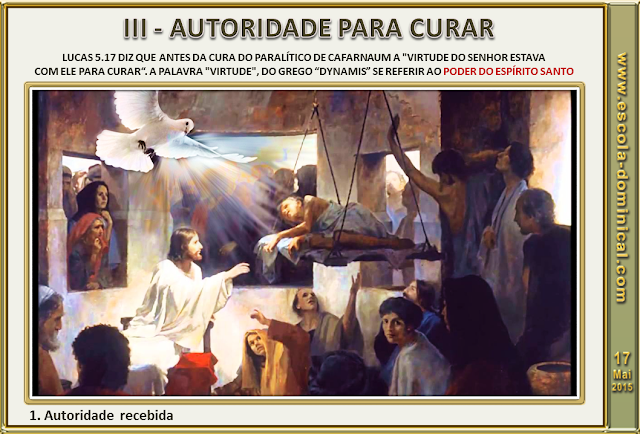 1. Autoridade recebida. Lucas, mais do que todos os outros evangelistas, associa a pessoa do Espírito Santo ao ministério de cura de Jesus (Lc 4.16-18). O texto de Lucas 5.17 diz que antes da cura do paralítico de Cafarnaum a "virtude do Senhor estava com ele para curar" (Lc 5.17). A palavra "virtude", do grego dynamis é a mesma usada em Atos 1.8 para se referir ao poder do Espírito Santo. Dymanis é o poder do Espírito Santo para realizar milagres. Jesus curava os enfermos porque a unção do Espírito Santo estava sobre Ele. Esse é um fato relevante na teologia de Lucas. Ele retrata Jesus como sendo cheio do Espírito Santo (Lc 4.1), capacitado por esse mesmo Espírito para realizar milagres e também para curar os doentes (Lc 4.14; 5.17).